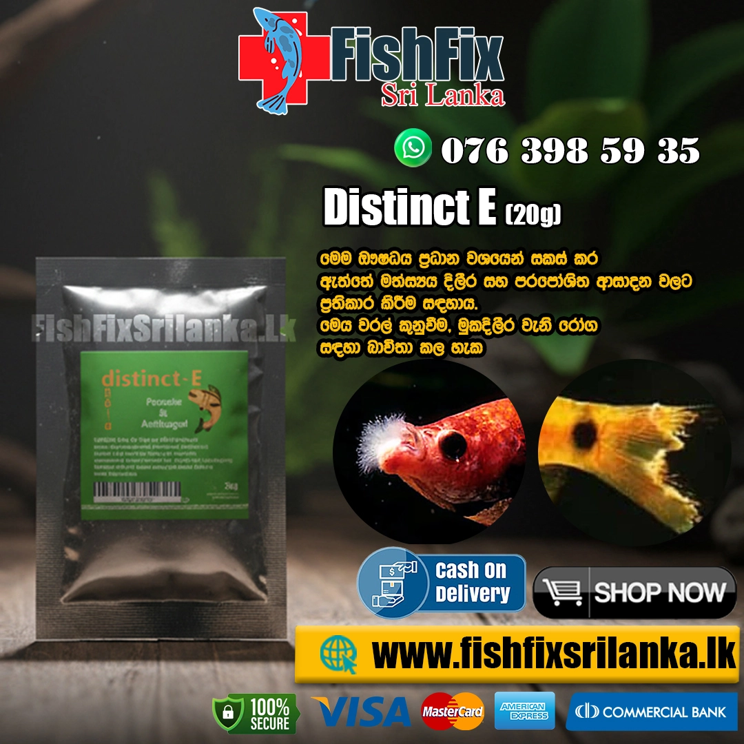 Target external bacterial infections with precision. Distinct – E is formulated to combat common problems like fin rot, tail rot, and mouth fungus (Cottonmouth), helping your fish heal quickly and restore their beautiful fins and scales.